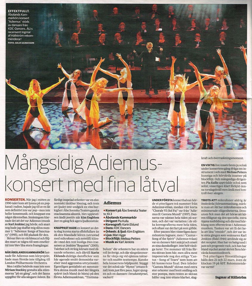Publiken bjuds på en sammanvävd helhet av dans, ljuskonst och musik. ADIEMUS framförs på ett språk som är påhittat av Karl Jenkins. Rösterna fungerar som instrument, och lyssnaren störs inte av ordens innebörd. Musiken är universell, oberoende av språk och kultur. Tre föreställningar gavs på ÅST:s stora scen under mars 2016. Läs recensionen i ÅU här. Under året 2019 gjordes projektet på nytt i Pargas och Kimito.